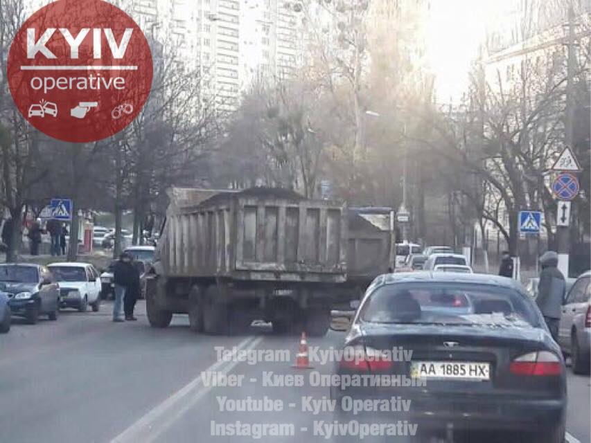 В Киеве произошло ДТП. Водитель грузовика с землей въехал в другой грузовик с землей. Из-за произошедшего образовалась большая пробка в обе стороны по улицу Кудряшова.