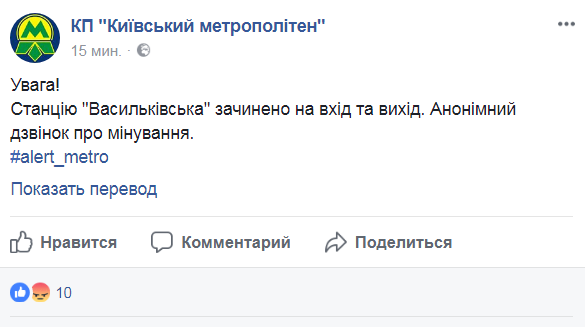 "Станция "Васильковская" закрыта на вход и выход. Анонимный звонок о минировании", - указано в опубликованном сообщении КП "Киевский метрополитен" в Facebook.