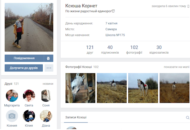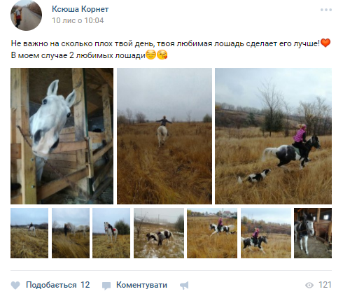Девушка размещает у себя на странице фотографии с лошадьми, которых она называет своими и пишет, что сдала на третий юношеский разряд по конному спорту.