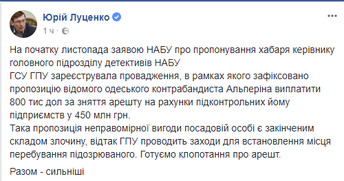 Генпрокуратура расследует дело о взяточнистве известного одесского контрабандиста Вадима Альперина. Именно от его лица предлагали руководителю главного подразделения детективов НАБУ 800 тыс. долл за снятие ареста с 450 млн грн на счетах его 20 фирм. Об этом сообщает в Facebook генпрокурор Юрий Луценко.