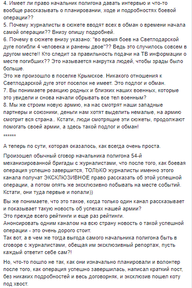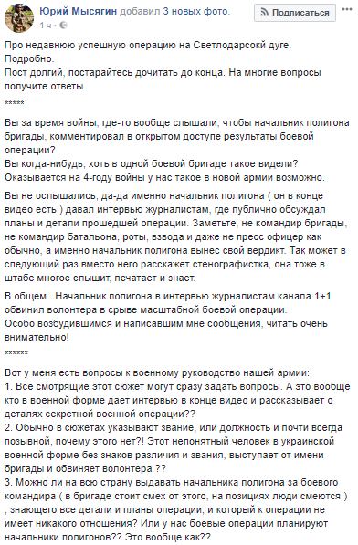 При этом сам волонтер дал многословный ответ в соцсети. В Facebook Юрий Мысягин сообщил, что произошел сговор начальника полигона 54-й механизированной бригады с журналистами, что после того, как боевая операция успешно завершится, журналисты этого канала получат эксклюзивное право рассказать об этой успешной операции и побывать на месте событий.