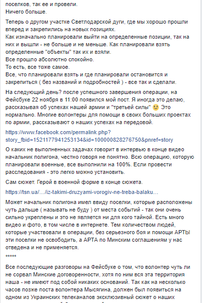 На следующий день после успешного завершения операции, 22 ноября в 11:00 появился скандальный пост. Волонтер не понимает о каком невыполненном задании заявил ТСН начальник полигона. По его данным, все выполнили на 100%. А более дальние поселки невозможно занять без тяжелой артиллерии, которая запрещена по минским договоренностям.