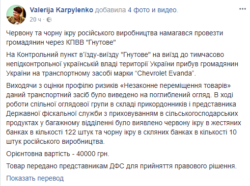 В зоне АТО на контрольном пункте "Гнутово" украинские пограничники изъяли у мужчины 122 банки красной и 10 банок черной икры на общую сумму 40 тыс. грн. Об этом сообщает пресс-секретарь Донецкого пограничного отряда Валерия Карпиленко в Facebook.