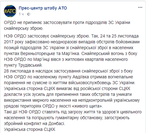 Сообщается, что 24 и 25 ноября были зафиксированы неоднократные случаи обстрелов сепаратистами позиций ВСУ из снайперского оружия в населенных пунктах Верхнеторецкое и Марьинка.