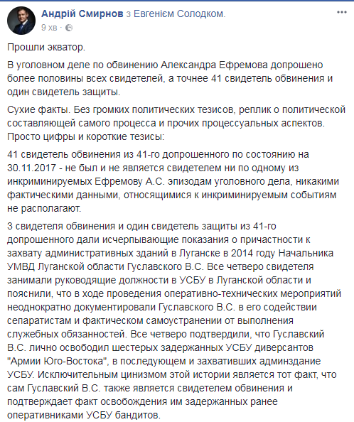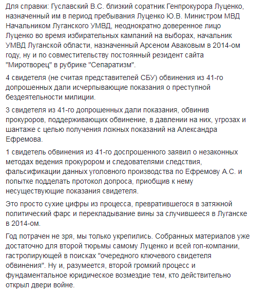 3 свидетеля обвинения и один свидетель защиты из 41-го допрошенного дали исчерпывающие показания о причастности к захвату административных зданий в Луганске в 2014 году Начальника УМВД Луганской области Гуславского В.С. Все четыре свидетеля занимали руководящие должности в УСБУ в Луганской области и пояснили, что в ходе проведения оперативно-технических мероприятий неоднократно документировали Гуславского В.С. в его содействии сепаратистам и фактическом самоустранении от выполнения служебных обязанностей. Все четверо подтвердили, что Гуславский В.С. лично освободил шестерых задержанных УСБУ диверсантов "Армии Юго-Востока", в последующем и захвативших админздание УСБУ. Исключительным цинизмом этой истории является тот факт, что сам Гуславский В.С. также является свидетелем обвинения и подтверждает факт освобождения им задержанных ранее оперативниками УСБУ бандитов.