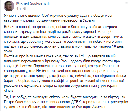 "Чтобы облегчить вам задачу, когда зайдете, можете открыть дверь теми же ключами, забрали у моего водителя "грабители", которые избили его у подъезда, и с помощью которых вы ставили в моей квартире камеры 10 дней назад", - написал Саакашвили.