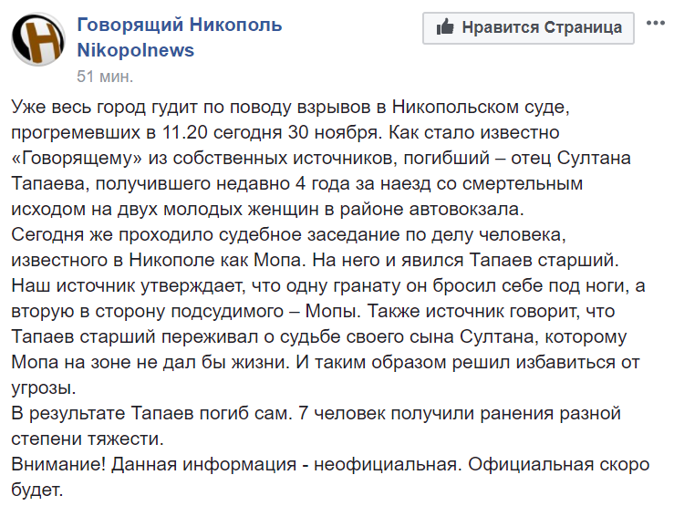 "Сегодня же проходило судебное заседание по делу человека, известного в Никополе как Мопа. На него и явился Тапаев-старший. Наш источник утверждает, что одну гранату он бросил себе под ноги, а вторую в сторону подсудимого – Мопы. Также источник говорит, что Тапаев-старший переживал о судьбе своего сына Султана, которому Мопа на зоне не дал бы жизни. И таким образом решил избавиться от угрозы".