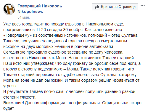 "Говорящий Никополь" в Facebook сообщает, что узнал из источников, что погибший – отец Султана Тапаева, получившего недавно 4 года за наезд со смертельным исходом на двух молодых женщин в районе автовокзала.