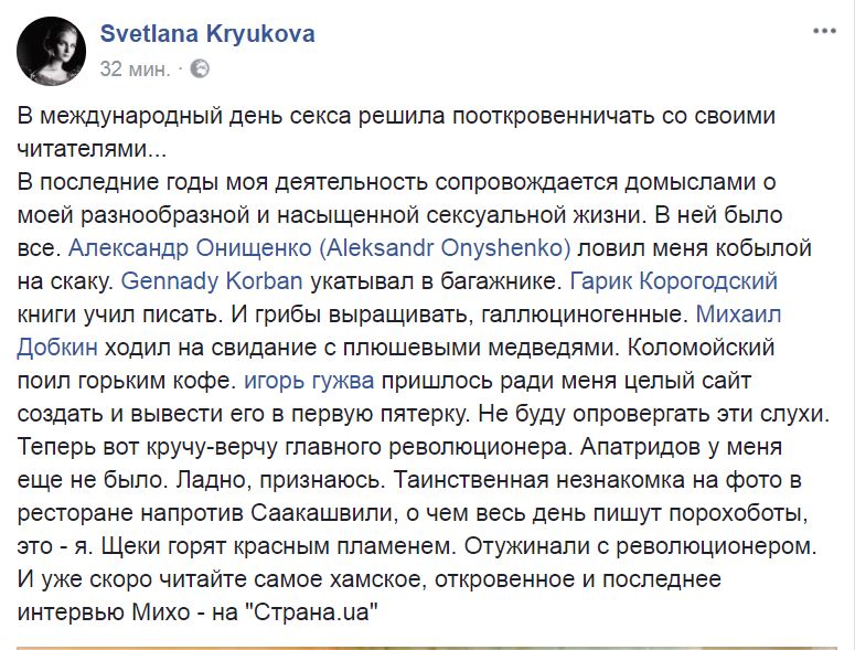 "В последние годы моя деятельность сопровождается домыслами о моей разнообразной и насыщенной сексуальной жизни. В ней было все. Александр Онищенко (Aleksandr Onyshenko) ловил меня кобылой на скаку. Gennady Korban укатывал в багажнике. Гарик Корогодскийкниги учил писать. И грибы выращивать, галлюциногенные. Михаил Добкин ходил на свидание с плюшевыми медведями. Коломойский поил горьким кофе. игорь гужва пришлось ради меня целый сайт создать и вывести его в первую пятерку. Не буду опровергать эти слухи. Теперь вот кручу-верчу главного революционера. Апатридов у меня еще не было. Ладно, признаюсь. Таинственная незнакомка на фото в ресторане напротив Саакашвили, о чем весь день пишут порохоботы, это - я. Щеки горят красным пламенем. Отужинали с революционером. И уже скоро читайте самое хамское, откровенное и последнее интервью Михо - на "Страна.ua", - написала Светлана Крюкова в своем Facebook.