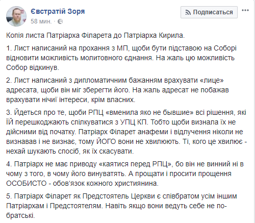 "Патриарх Филарет не обращался к патриарху Кириллу и к епископату Русской православной церкви с просьбой помиловать его и вернуть в Церковь (…) Распространяется провокационная информация, которая не соответствует действительности. Патриарх Филарет никогда не направлял и не будет направлять в адрес Русской православной церкви, патриарха Кирилла или кого-либо другого просьбу о помиловании… Никогда патриарх Филарет никаких писем, заявлений или обращений подобного содержания не направлял, не направляет и направлять не будет", - сказал архиепископ Евстратий (Зоря).