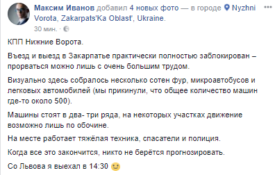 "Въезд и выезд в Закарпатье практически полностью заблокирован – прорваться можно лишь с очень большим трудом. Визуально здесь собралось несколько сотен фур, микроавтобусов и легковых автомобилей (общее количество машин где-то около 500). Машины стоят в два- три ряда, на некоторых участках движение возможно лишь по обочине.