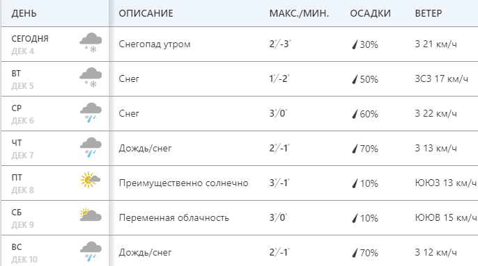 Сайт Gismeteо прогнозирует на протяжении всей недели +1...+3. В течение всей недели обещают дождь со снегом. Без осадков 8 и 9 декабря.