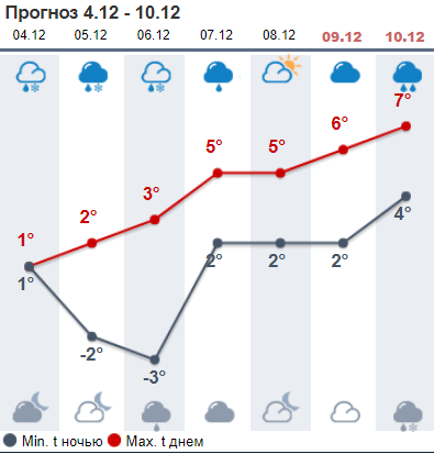 Сайт Sinoptik.ua обещает +1...+3 на неделе и мокрый снег. Солнце проглянет только 8 и 9 декабря - в пятницу и субботу.