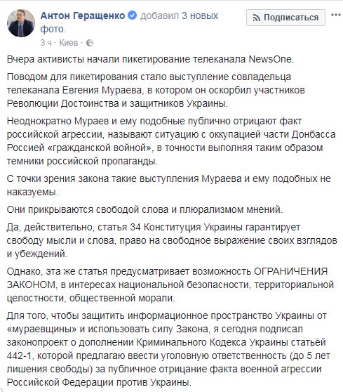 "Для того, чтобы защитить информационное пространство Украины от "мураевщины" и использовать силу закона, я сегодня подписал законопроект о дополнении Криминального Кодекса Украины статьей 442-1, которой предлагаю ввести уголовную ответственность (до 5 лет лишения свободы) за публичное отрицание факта военной агрессии Российской Федерации против Украины. Завтра этот законопроект я зарегистрирую в Верховной Раде и предлагаю внести его в повестку дня", - написал Геращенко.
