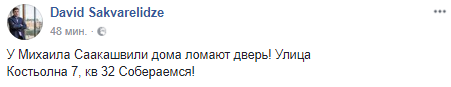 "У Михаила Саакашвили дома ломают дверь! Улица Костьолна 7, кв. 32. Собираемся!" - написал Сакварелидзе.