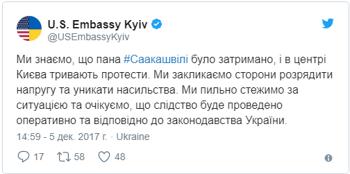 "Мы знаем, что господин Саакашвили был задержан, и в центре Киева продолжаются протесты. Мы призываем стороны разрядить напряжение и избегать насилия. Мы внимательно следим за ситуацией и ожидаем, что следствие будет проведено оперативно и в соответствии с законодательством Украины", - говорится в сообщении.