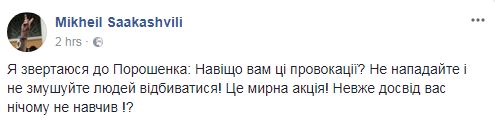 "Я обращаюсь к Порошенко. Зачем вам эти провокации? Не нападайте и не заставляйте людей отбиваться! Это мирная акция! Неужели опыт вас ничему не научил!?", – заявил Саакашвили.