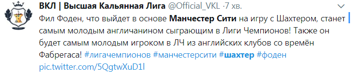 21:33 Фил Фоден, что выйдет в основе Манчестер Сити на игру с Шахтером, станет самым молодым англичанином сыграющим в Лиги Чемпионов! Также он будет самым молодым игроком в ЛЧ из английских клубов со времён Фабрегаса!
