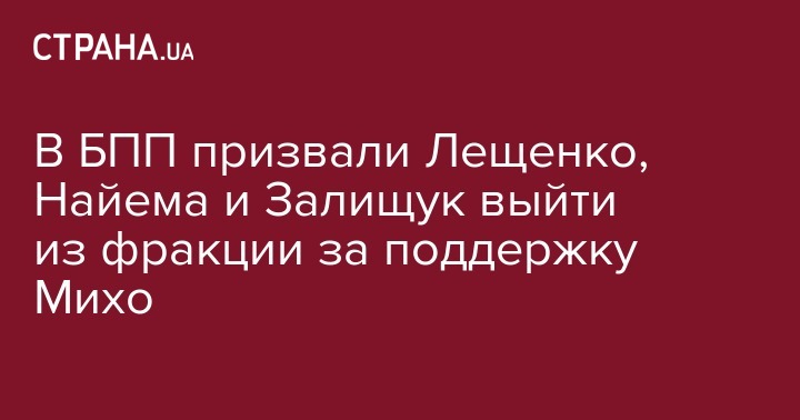 В президентском БПП призвали своих оппозиционных нардепов Светлану Залищук, Сергея Лещенко и Мустафу Найема выйти из состава фракции. Нардепы активно участвуют в митингах Михаила Саакашвили, которого обвиняют в связях с олигархом Сергеем Курченко.