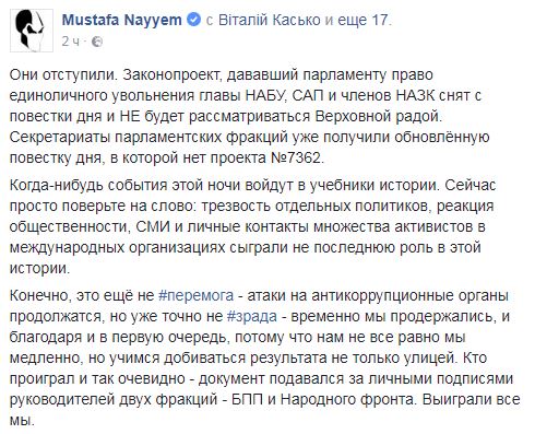 "Они отступили. Законопроект, дававший парламенту право единоличного увольнения главы НАБУ, САП и членов НАЗК снят с повестки дня и НЕ будет рассматриваться Верховной радой", - написал Найем.