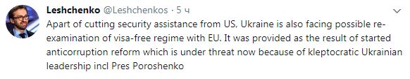 "Помимо сокращения помощи в области безопасности от США, Украина также сталкивается с возможным пересмотром безвизового режима с ЕС. Он был предоставлен в результате начатой антикоррупционной реформы, которая сейчас находится под угрозой из-за клептократического руководства Украины, в том числе президента Порошенка", - написал Лещенко в Twitter.