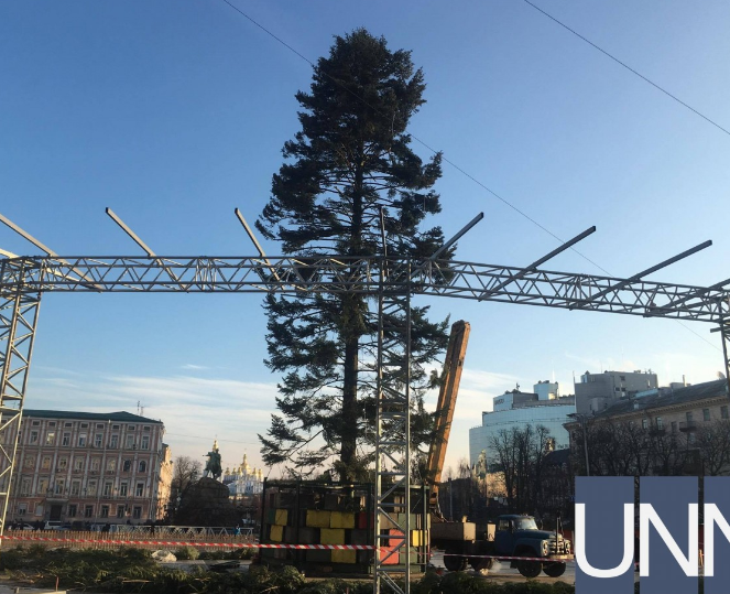 Главную новогоднюю елку Украины, которую вчера подняли на Софийской площади, все еще крепят на кострукции.