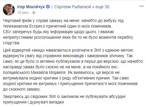 "Так же, как в первые дни активно пуликуемые версии, что якобы на самом деле покушение было совершено не на меня, а на покойного экс-полицейского Михаила Мормиля. Как оказалось, эта версия не выдерживала никакой критики по ряду объективных причин. Так же никакой критики не выдерживает и предположения причастности моих помощников до совершенного покушения", - написал Мосийчук.