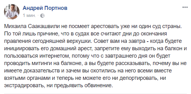 0.36 - "Михаила Саакашвили не посмеет арестовать уже ни один суд страны. По той лишь причине, что в судах все считают дни до окончания правления сегодняшней верхушки. Совет вам на завтра - когда будете инициировать его домашний арест, запретите ему выходить на балкон и пользоваться интернетом, потому что с завтрашнего дня он будет проводить митинги на балконе, а вы будете рассказывать, почему вы не имеете доказательств и зачем вы охотились на него всеми вместе взятыми органами и теперь не можете его ни депортировать, ни экстрадировать, ни предьявить обвинение", пишет у себя в Facebook известный юрист Андрей Портнов.