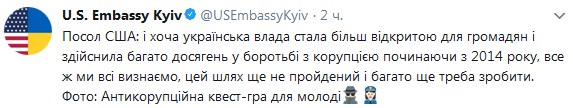 "Хотя украинская власть стала более открытой для граждан и совершила много достижений в борьбе с коррупцией начиная с 2014 года, все же мы все признаем, что этот путь еще не пройден и много еще нужно сделать", - говорится в сообщении.