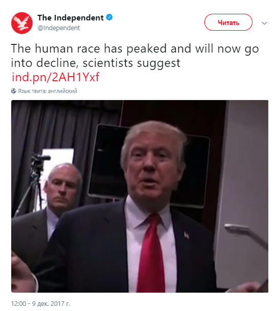 Газета The Independent проиллюстрировала статью об упадке человечества фотографией Дональда Трампа. Об этом говорится в сообщении издания в Twitter.
