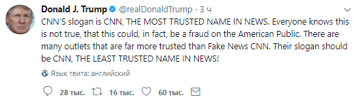"Лозунг CNN - CNN, новостной бренд, которому следует доверять больше всего. Все знают, что это неправда, что на самом деле это может быть мошенничество в отношении общественности США", - написал Трамп.