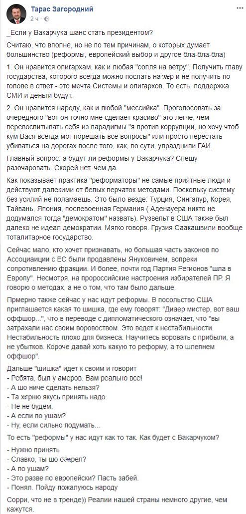 Тарас Загородний рассуждает, есть ли у Вакарчука шанс стать президентом:
