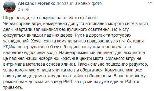 По его словам, из-за порывов ветра, намерзания дождя и налипания мокрого снега в городе, некоторые кварталы остались без уличного освещения. По городу фиксировались случаи падения деревьев. Движение на дорогах и тротуарах было затруднено, хотя техника коммунальщиков работала всю ночь.