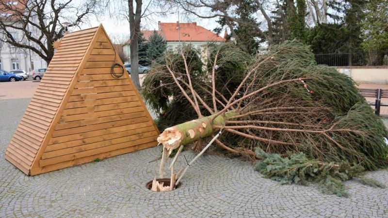 Силы ветра не выдержала и сломалась рождественская елка на площади святой Троицы в городе Ступава. Дерево с площади убрали коммунальные службы.