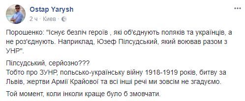 "Пилсудский, серьезно??? То есть о ЗУНР, польско-украинской войне 1918-1919 годов, битве за Львов, жертвах Армии Крайовой и всех других вещах мы вовсе не вспоминаем. Тот момент, когда иногда лучше было бы промолчать".