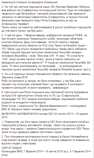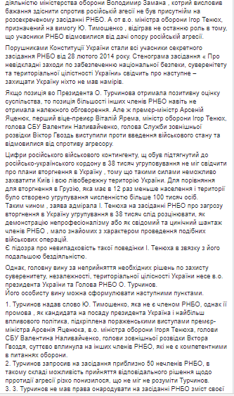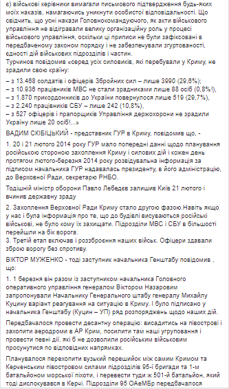 В частности, по его данным, во время крымских событий и.о. президента Турчинов не обязан был созывать 28 февраля 2014 г. заседание СНБОУ. Однако Турчинов передал свои полномочия в части использования ВСУ на случай вооруженной агрессии другому органу - СНБО, у которого таких полномочий нет согласно Конституции Украины.