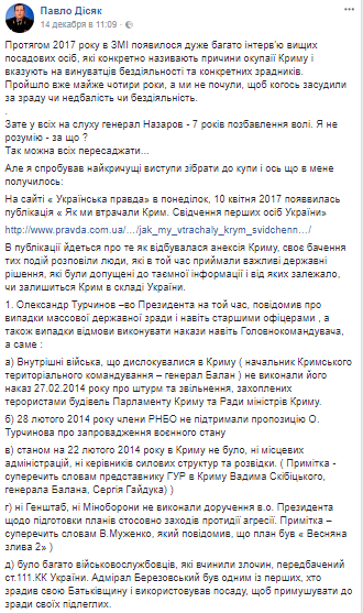 Бывший военком Винницкой области, генерал-майор Павел Дисяк, воевавший в АТО, добился начала досудебного расследования бездеятельности должностных лиц Украины, которые привели к утрате Крыма.