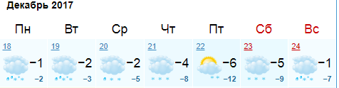 Сайт Gismeteо обещает осадки в виде мокрого снега всю неделю. Днем -1...-2. С четверга по субботу ресурс обещает морозный пик: -4...-6 днем. Ночью -2...-9. С 21 на 22 декабря до -12 в темное время суток.