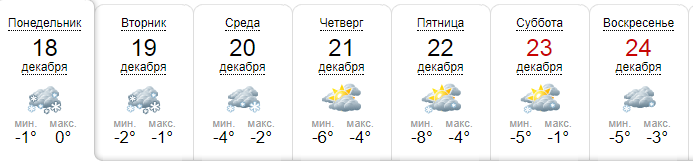 Сайт Sinoptik.ua обещает ощутимый снег в первые три дня рабочей неделе, затем небольшой снег будет срываться периодически. Днем 0...-4. Холоднее всего будет в четверг и пятницу: 21 и 22 декабря.