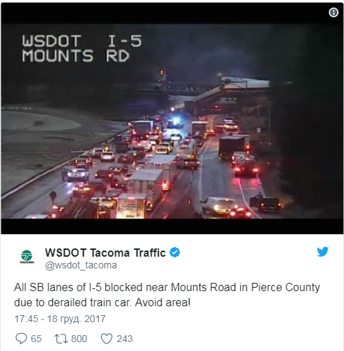 В округе Пирс, штат Вашингтон с рельс сошел пассажирский поезд "501 Amtrak". ЧП произошло на мосту. По крайней мере один вагон завис в воздухе над автомагистралью "5".