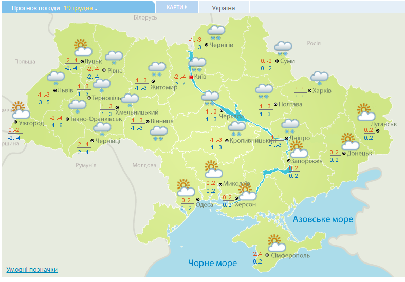 Во вторник, 19 декабря, на дорогах страны, кроме юга и востока, гололедица, ночью и утром в западных и северных областях порывы ветра 15-18 м/с, метели. На Черниговщине и Киевщине сильный снег.