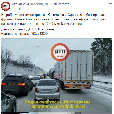 По данным dtp.kiev.ua, наиболее сложная ситуация на Житомирской и Одесской трассах. "Дальнобойщики очень сильно ругаются в эфире. Люди идут пешком или просто стоят по 10-20 мин без движения", - говорится в сообщении.
