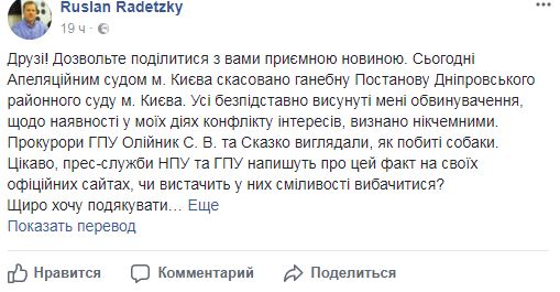 "Друзья! Позвольте поделиться с вами приятной новостью. Сегодня Апелляционным судом Киева отменено позорное постановление Днепровского районного суда Киева", - написал он.
