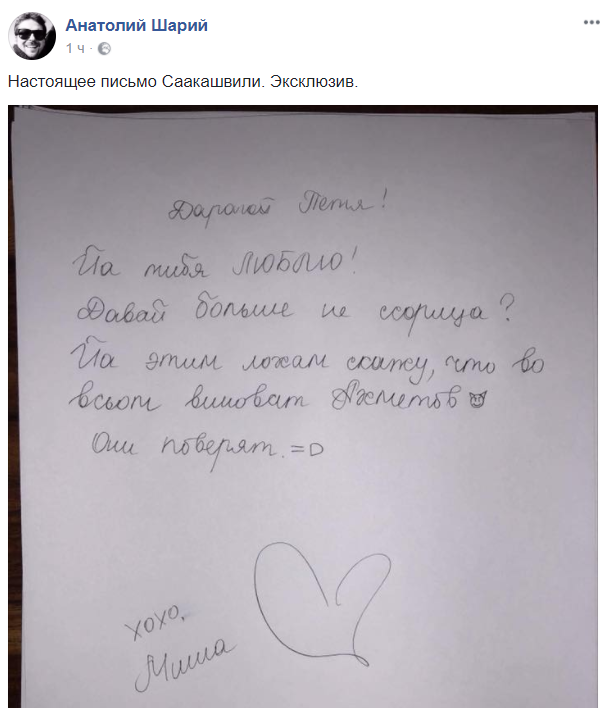 В унисон ему журналистка Татьяна Высоцкая призвала передать текст на экспертизу графологу. А журналист Анатолий Шарий в насмешку выложил свой вариант "письма Саакашвили":