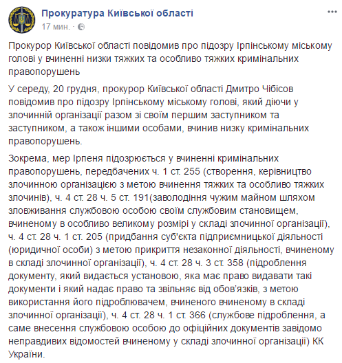 Прокуратура напоминает, что это уже второе подозрение ирпенскому городскому голове.