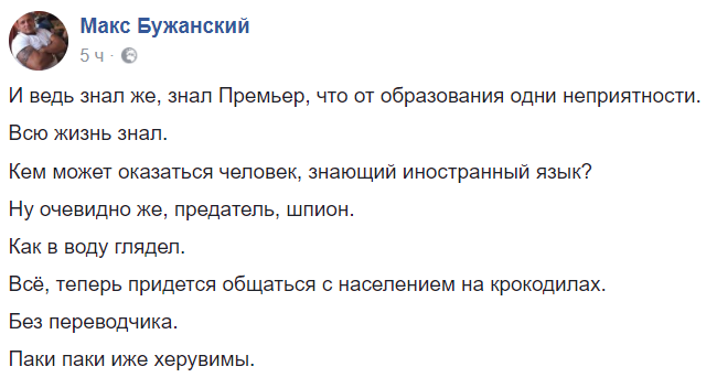 Блогер Макс Бужанский тоже "прошелся" по премьеру, который теперь, мол, будет чураться образованных людей.