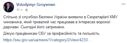 СБУ несколько месяцев следила за помощником премьер-министра Владимира Гройсмана, которого задержали по подозрению в шпионаже.