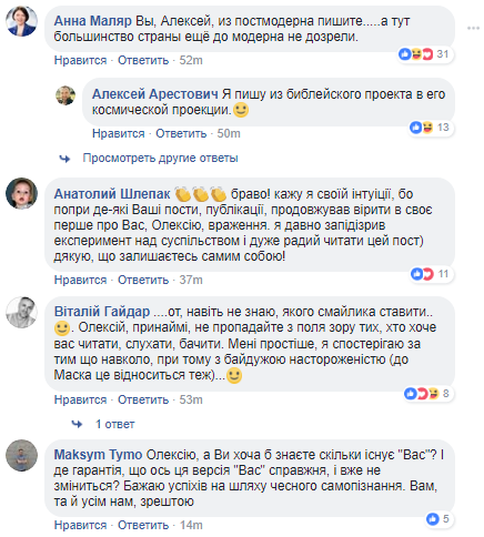 "На вопросы восстановления исторической памяти, справедливости, борьбы, побед и поражений, становления наций, языка/-ов, закрытия исторических ран, я смотрю, как солдат на вошь. Мне на них плевать слюной с высокой вышки ноосферизма. Я даже признаю их важность, просто мне неинтересно", написал Арестович.