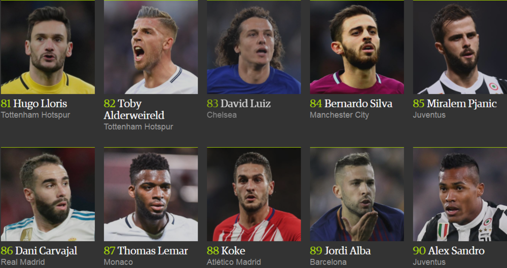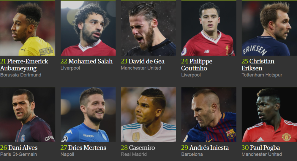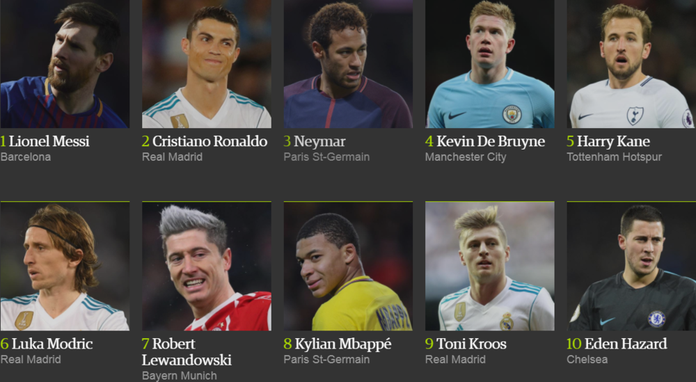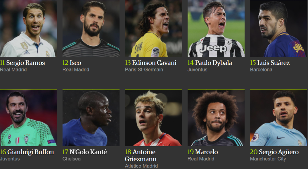 Лионель Месси победил в рейтинге The Guardian в четвертый раз (2012, 2013, 2015, 2017), в то время как Криштиану Роналду признавался лучшим дважды (2014 и 2016 год).