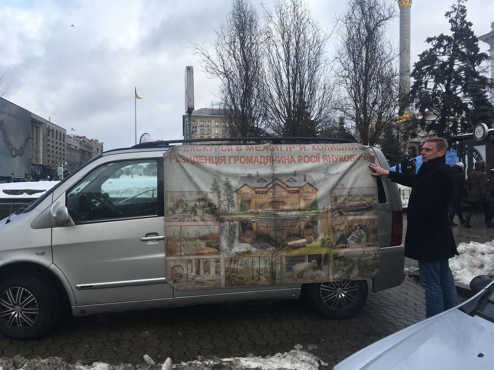 12:52 Около митинга мужчина через громкоговоритель приглашает гостей столицы на экскурсию в Межигорье. На что он намекает сторонникам Порошенко?